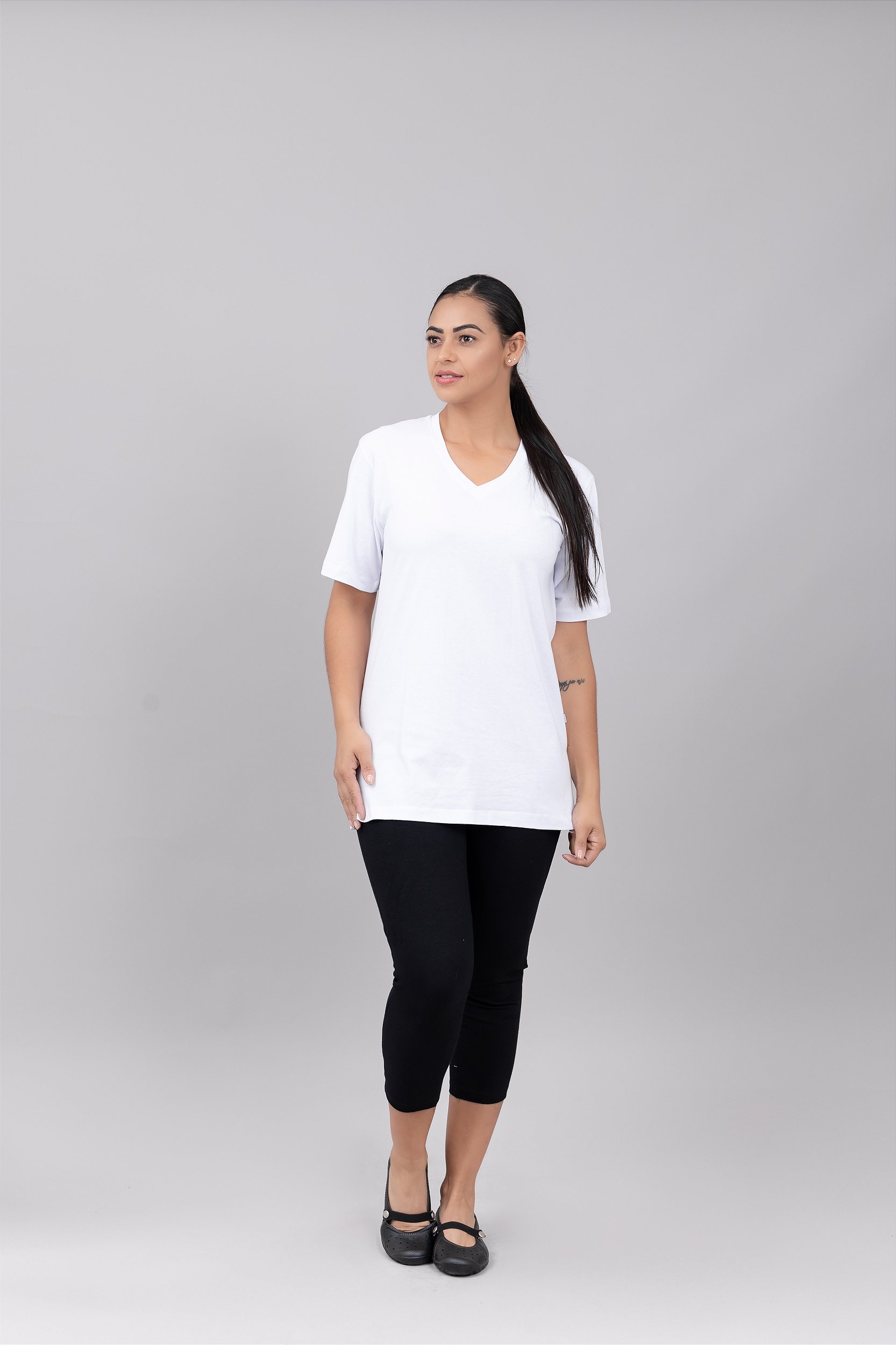 CAMISETA FEMININA DECOTE V, MANGA CURTA - BRANCA